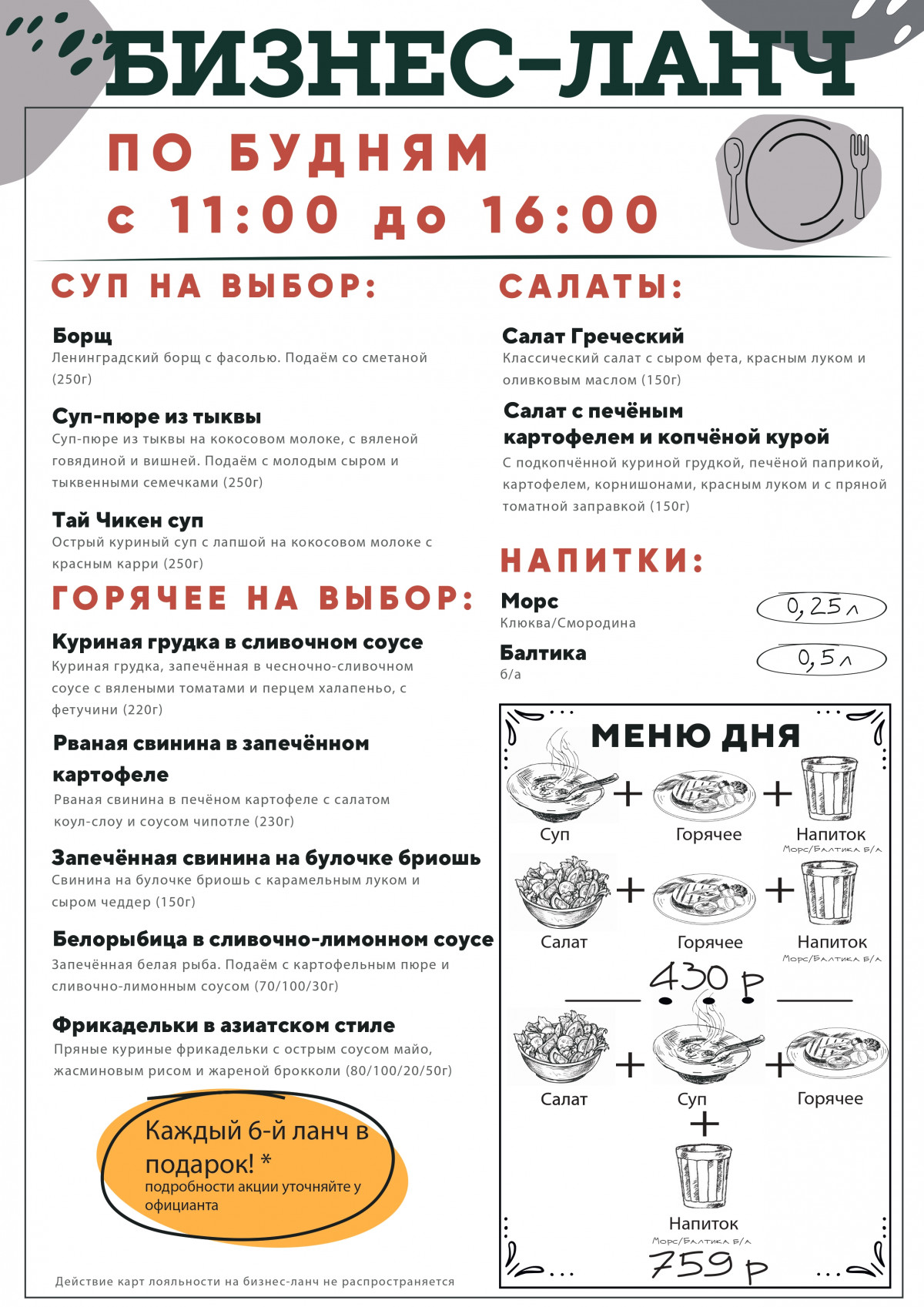 В акции участвуют только блюда из меню "Бизнес-ланч" с 11:00 до 16:00 по будням (кроме праздничных дней )